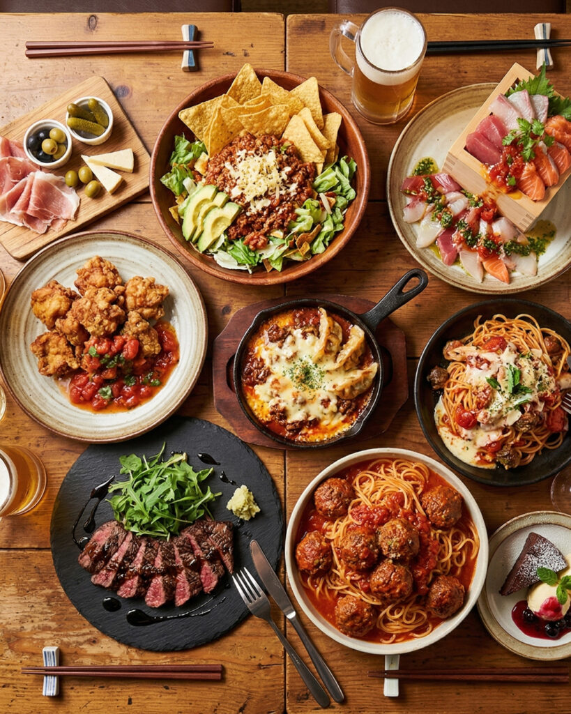 豪快さの中に、ちゃんと丁寧さ。シャルの料理は、香ばしく焼き上げる肉料理と、とろけるチーズ、鉄板の熱々メニューが主役です。名物のこぼれ枡パッチョや鉄板マグマ餃子ラザニア、だし巻き卵クワトロフォルマッジなど、遊び心はありつつ味は本格派。大衆の気軽さはそのままに、味だけは妥協しないのがシャル流です。