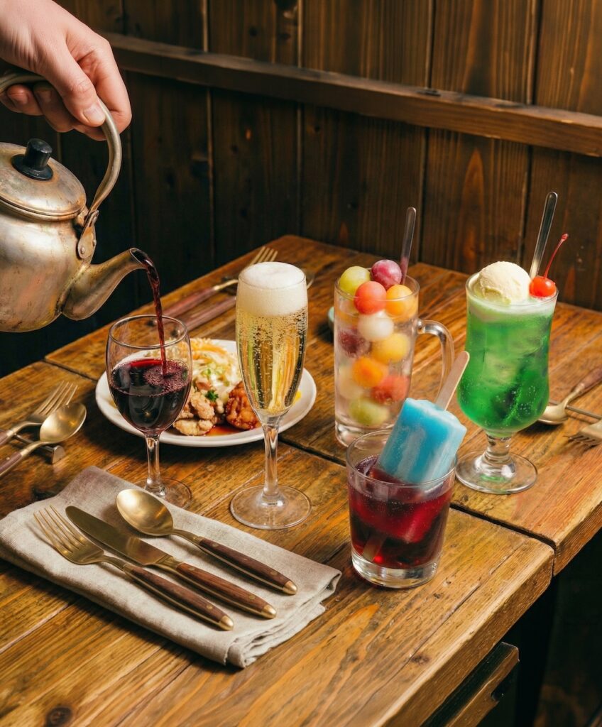 こぼれるスパークリングとなみなみワイン、遊び心ドリンクも充実